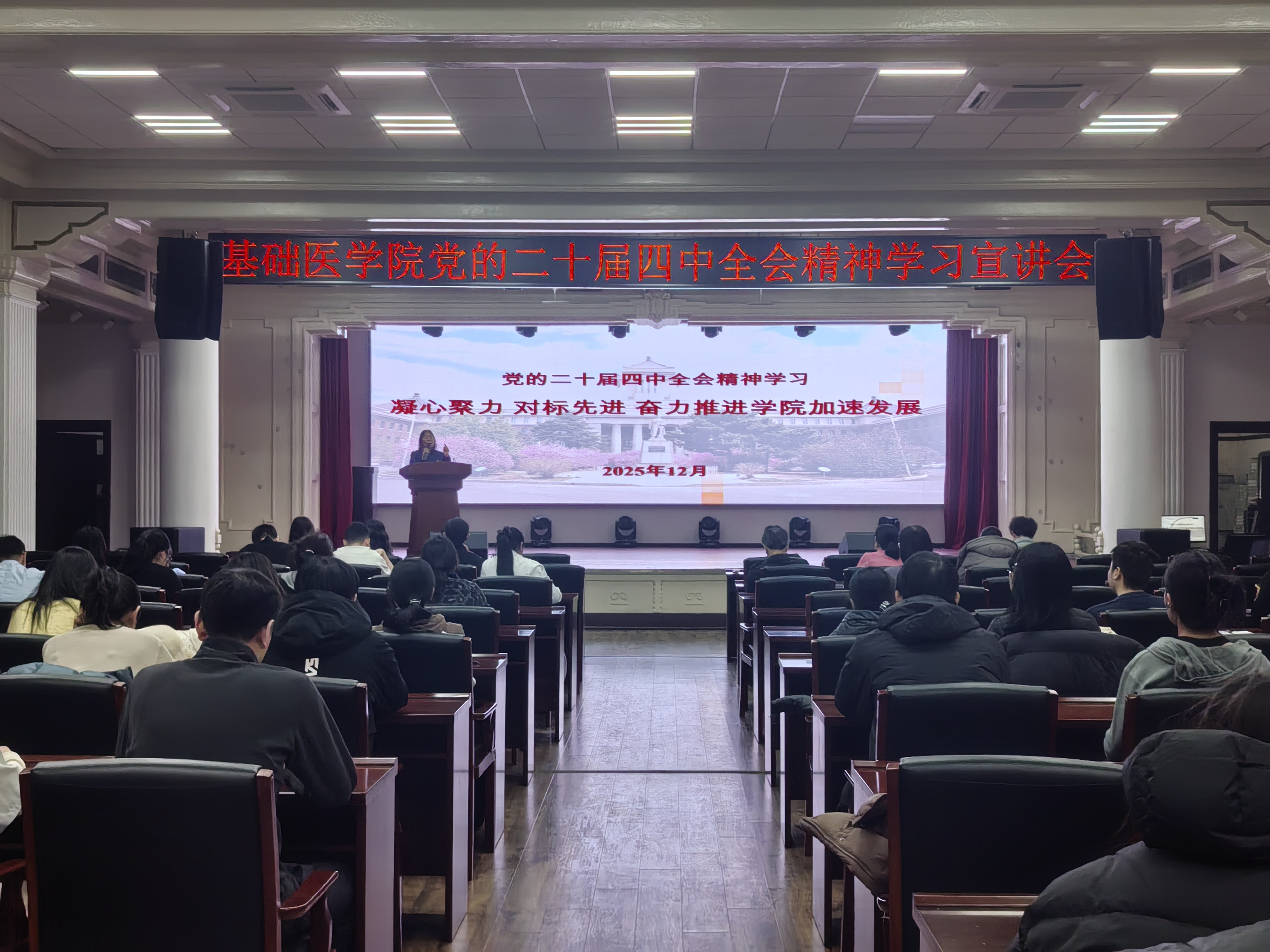 12月22日,永利集团3044官网欢迎您党委召开全体党员大会,党委书记王晓荣以《凝心聚力,对标先进,奋力推进学院加速发展》为题作领学发言,带领学院全体党员共同深入学习党的二十届四中全会精神。